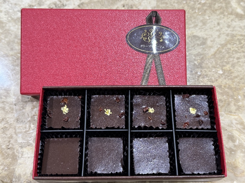 カカオ70%のグアナラをベースにヴァローナのチョコレートだけで3層に仕上げ、オーガニックのカカオニブと金沢の金箔をトッピングしました